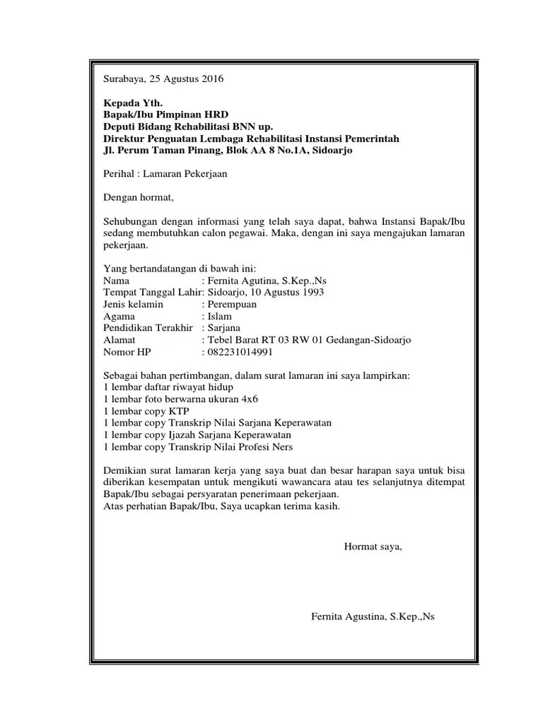 Contoh Surat Lamaran Kerja Bnn. Dan panduan tips melamar kerja agar cepat. Contoh surat lamaran kerja yang baik dan benar. Dengan contoh surat lamaran kerja yang tepat akan memudah kamu dalam membuatnnya. Postingan ini jawaban jika anda mencari surat lamaran. Surat lamaran kerja juga penting bagi kamu yang masih kuliah namun ingin magang di sebuah perusahaan untuk mendapat pengalaman. Surat lamaran kerja cpns harus diperhatikan dengan baik, pastikan untuk melakukan cek karena jika surat lamaran kerja yang anda tulis ternyata tidak sesuai dengan ketentuan yang dibuat maka bisa menjadi penghambat untuk anda.